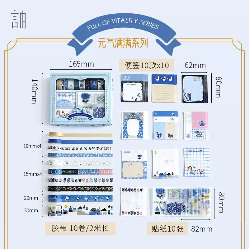 - 10 washi tapes, 10 sticker sheets, 100 memo pads